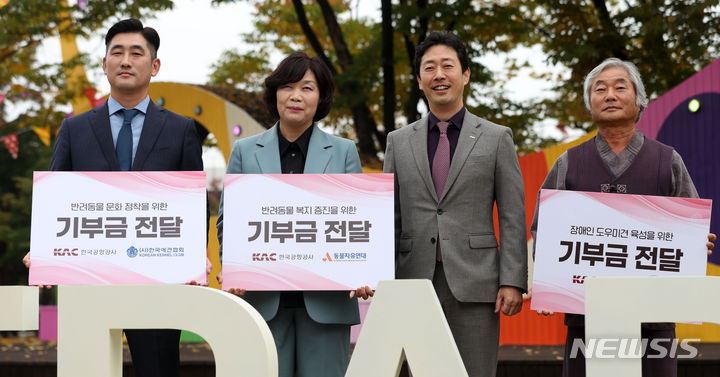 [서울=뉴시스] 김선웅 기자 = 윤형중 한국공항공사 사장이 26일 서울 강서구 김포국제공항에서 열린 펫파크 개소식에서 한국애견협회, 동물자유연대, 한국장애인도우미견협회에 반려동물 문화 정착, 복지 증진, 장애인 도우미견 육성을 위한 기부금을 전달하고 있다. 2023.10.26. [email protected]