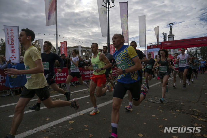 [키이우=AP/뉴시스] 29일(현지시각) 우크라이나 키이우에서 '세계 최장 마라톤'이라고 부르는 1㎞ 달리기 대회가 열려 참가자들이 힘차게 달리고 있다. 군인들을 예우하고 우크라이나 방공시스템 강화 기금을 모으는 목적으로 열린 이 대회에 약 2000명의 우크라이나인이 참가했고 전 세계에서 약 1만3000명이 온라인으로 등록했다. 주최 측은 "우크라이나가 자유를 위해 싸워온 경주는 아직 끝나지  않아 이 대회를 '세계 최장 마라톤'이라고 부른다"라고 밝혔다. 2023.10.30.