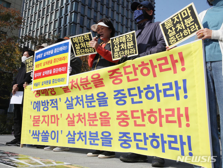 [서울=뉴시스] 김명원 기자 = 한국동물보호연합 회원들이 30일 서울 종로구 광화문 광장 이순신동상 앞에서 '럼피스킨' 묻지마 살처분 중단을 촉구하는 기자회견을 하고 있다. 2023.10.30. [email protected]