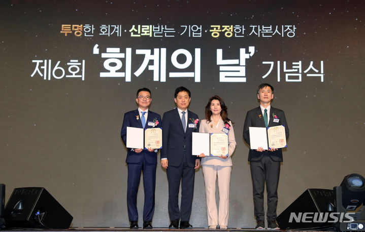 [서울=뉴시스] 김명년 기자 = 김주현 금융위원회 위원장이 31일 오후 서울 영등포구 63스퀘어에서 열린 '제6회 회계의 날 기념식'에서 대통령 표창을 시상한 뒤 수상자들과 기념촬영을 하고 있다. 왼쪽부터 배홍기 서현회계법인 대표와 김 위원장, 윤정숙 금융감독원 국장, 김봉환 서울대학교 교수. 2023.10.31. [email protected]