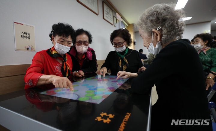 [서울=뉴시스] 김선웅 기자 = 31일 서울 양천구 신원경로당에 조성된 스마트경로당에서 어르신들이 스마트 테이블을 사용하고 있다. 스마트 경로당은 IoT 등 첨단 정보통신기술에 기반한 디지털 여가 및 맞춤형 콘텐츠 화상 플랫폼, 디지털 교육, 스마트 건강관리 프로그램 등 맞춤형 서비스를 제공한다. 양천구는 관내 10개 구립 경로당에 디지털 기술을 적용해 스마트한 안전·건강관리 시스템을 구축하고 있다. 2023.10.31. [email protected]