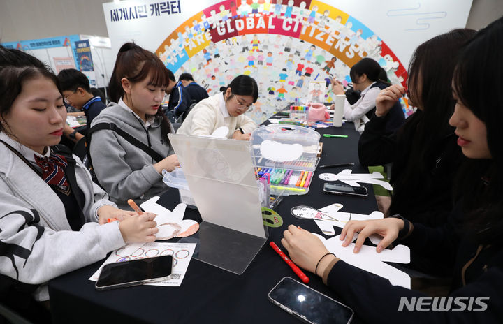 [인천=뉴시스] 전진환 기자 = 31일 오후 인천 연수구 송도컨벤시아에서 열린 제2회 세계를 품은 인천교육 한마당에서 학생들이 세계시민캐릭터 그리기 부스에서 자신의 얼굴을 닮은 그림을 그리고 있다. 2023.10.31. [email protected]