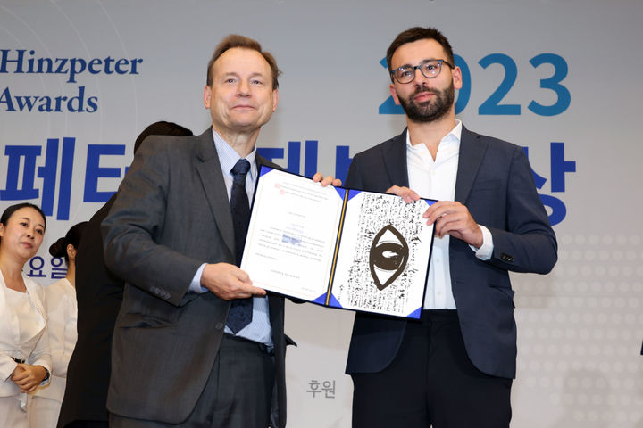 [광주=뉴시스] 이영주 기자 = 지난 8일 오후 국회도서관 대강당에서 열린 2023 힌츠페터 국제보도상 시상식에서 특집부문 수상자 클레망 디 로마(Clement Di Roma)가 상을 수상하고 있다.(사진 = 5·18기념재단 제공) 2023.11.09. [email protected] *재판매 및 DB 금지