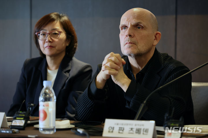 [서울=뉴시스] 박진희 기자 = 서울시립교향악단 얍 판 츠베덴(Jaap van Zweden) 차기 음악감독과 손은경 대표이사가 20일 서울 중구 더 플라자 호텔에서 '2024 서울시향 시즌 오픈 기자간담회'를 하고 있다. 2023.11.20. [email protected]