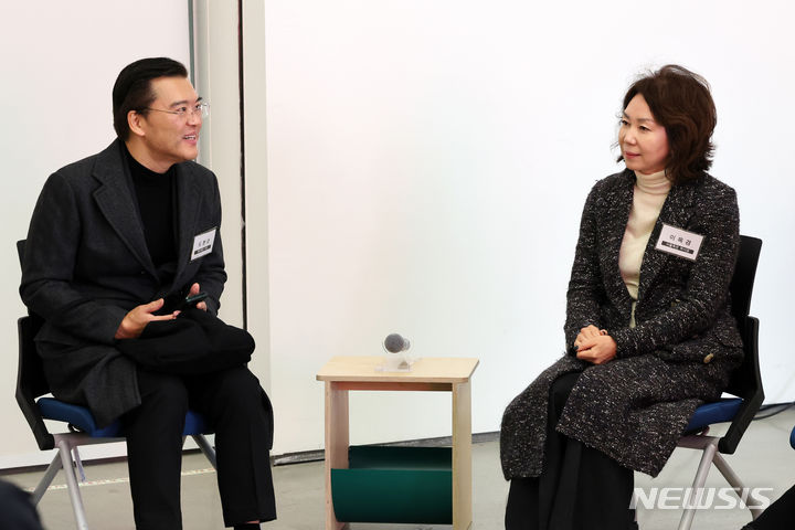 [서울=뉴시스] 박진희 기자 = 이옥경 서울옥션 부회장과 도현순 케이옥션 대표가 21일 서울 종로구 국립현대미술관 서울에서 열린 유인촌 장관의 '미술계 현장간담회'에 참석하여 인사를 나누고 있다. 2023.11.21. [email protected]