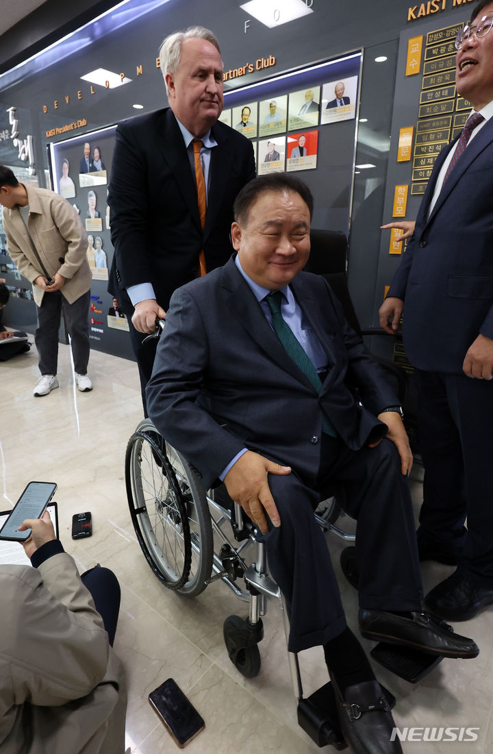 [대전=뉴시스] 강종민 기자 = 인요한 국민의힘 혁신위원장이 21일 대전 유성구 카이스트에서 열린 한국정치의 문제점과 개혁방안 강연회에서 만난 이상민 더불어민주당 의원의 휠체어를 밀어주며 배웅하고 있다. 2023.11.21. [email protected]