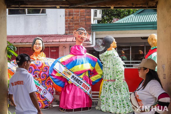[앙고노=신화/뉴시스] 22일(현지시각) 필리핀 리잘주 앙고노에서 '히간테스(거인) 축제'가 열려 화려한 색상을 입힌 대형 종이 거인들이 거리를 따라 퍼레이드를 펼치고 있다. 히간테스 축제는 앙고노 주민들이 어부들의 수호성인인 성 클레멘테를 기리는 축제에서 유래했다. 2023.11.23.