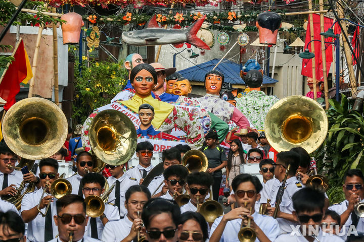 [앙고노=신화/뉴시스] 22일(현지시각) 필리핀 리잘주 앙고노에서 '히간테스(거인) 축제'가 열려 화려한 색상을 입힌 대형 종이 거인들이 거리를 따라 퍼레이드를 펼치고 있다. 히간테스 축제는 앙고노 주민들이 어부들의 수호성인인 성 클레멘테를 기리는 축제에서 유래했다. 2023.11.23.