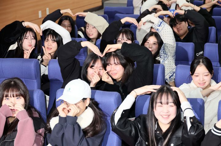 [부산=뉴시스] 하경민 기자 = 23일 부산 사상구 동서대학교에서 열린 고교 수험생 초청 입시설명회에 참석한 경혜여고 학생들이 국제화 프로그램 등에 대한 설명을 들으며 그동안 쌓였던 입시 스트레스를 날려버리고 있다. (사진=동서대 제공) 2023.11.23. [email protected] *재판매 및 DB 금지