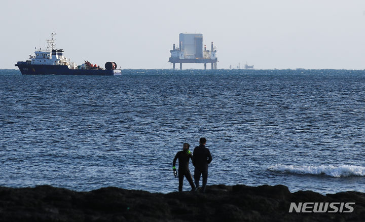 [서귀포=뉴시스] 우장호 기자 = 국내 최대 우주위성개발 업체 한화시스템이 자체 제작한 고해상도 지구 관측위성(SAR·합성개구레이다)이 금명간 발사된다. SAR은 공중에서 지상·해양에 쏜 레이다의 반사파를 미세한 시간차로 합성, 지상 지형도를 만들어내는 시스템이다. 28일 오후 제주 서귀포시 예래동 인근 해상에 위성 발사를 위한 바지선이 정박해 있다. 2023.11.28. [email protected]