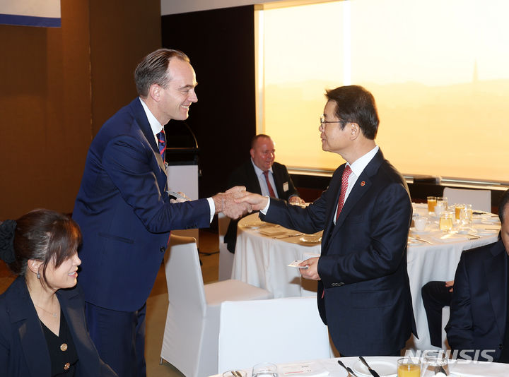 [서울=뉴시스] 김명년 기자 = 이정식 고용노동부 장관이 29일 오전 서울 용산구 그랜드하얏트 호텔에서 열린 주한 유럽기업 CEO 간담회에서 참석자와 인사를 나누고 있다. 2023.11.29. [email protected]