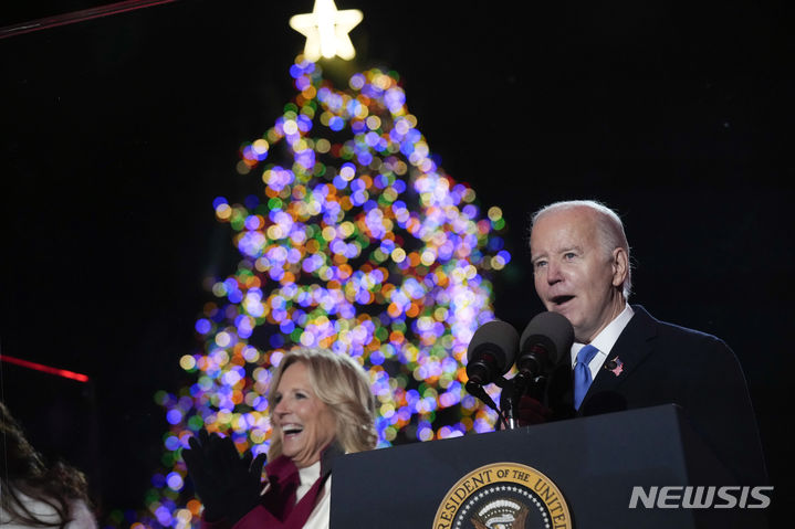 [워싱턴=AP/뉴시스] 조 바이든 미국 대통령이 지난달 30일(현지시각) 백악관 타원 잔디 광장 '엘립스'에서 내셔널 크리스마스트리에 점등한 후 부인 질 바이든 여사 옆에서 연설하고 있다. 2023.12.01.