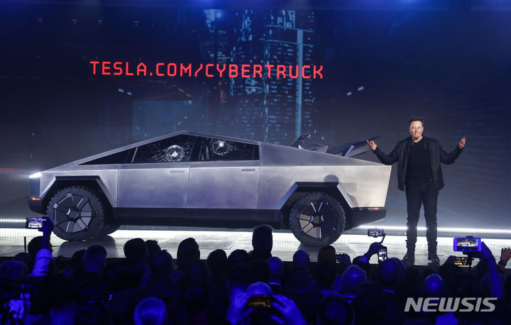 [호손=AP/뉴시스] 테슬라가 신차인 전기 픽업트럭 사이버트럭을 고객에게 처음 인도하며 판매 가격을 공개했다고 월스트리트저널(WSJ)이 지난 30일(현지시간) 보도했다. 사진은 일론 머스크 테슬라 최고경영자가 2019년 11월21일 캘리포니아 호손 디자인센터에서 사이버트럭 시제품을 공개하는 모습. 2023.12.01.