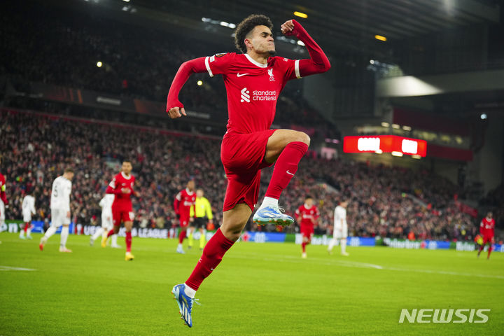 [리버풀=AP/뉴시스] 리버풀(영국)의 루이스 디아스가 지난달 30일(현지시각) 영국 리버풀의 안필드 경기장에서 열린 2023-24 유럽축구연맹(UEFA) 유로파리그 조별리그 E조 5차전 LASK 린츠(오스트리아)와 경기 전반 12분 선제골을 넣고 환호하고 있다. 리버풀이 4-0으로 승리해 조 1위로 16강에 진출했다. 2023.12.01.