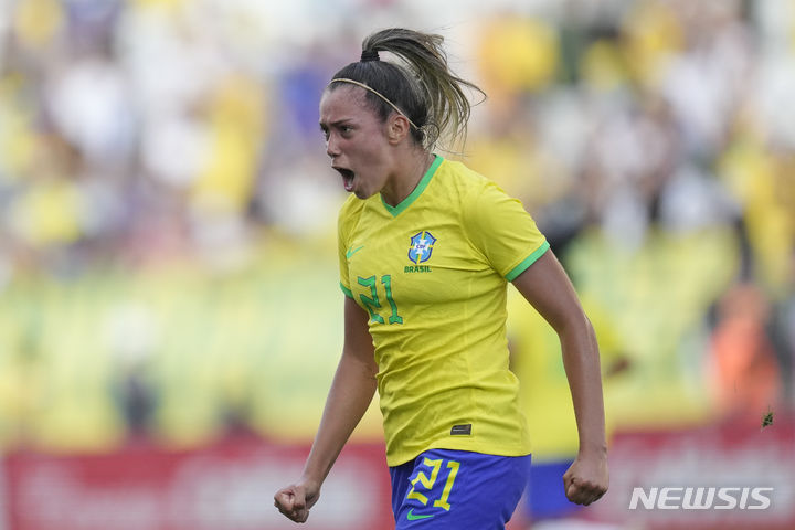 [상파울루=AP/뉴시스] 브라질의 프리실라 시우바가 지난달 30일(현지시각) 브라질 상파울루의 네오 퀴미카 아레나에서 열린 일본과의 여자축구 친선 경기 후반 추가시간 팀의 네 번째 골을 넣고 기뻐하고 있다. 브라질은 경기 종료 직전 터진 차세대 스타 프리실라의 결승 골로 일본에 4-3 신승을 거뒀다. 2023.12.01.