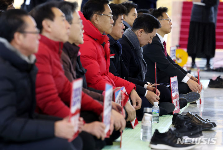 [서울=뉴시스] 추상철 기자 = 김기현 국민의힘 당 대표가 1일 오전 서울 여의도 국회에서 열린 비상의원총회에 참석해 있다. 2023.12.01. [email protected]