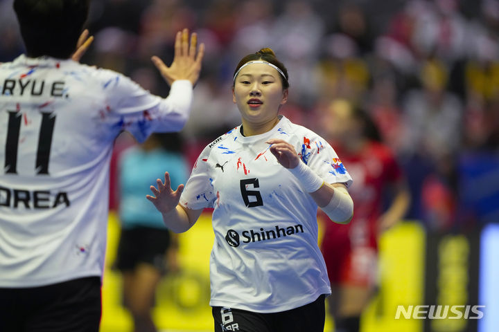 [스타방에르=AP/뉴시스] 송지영(오른쪽)이 1일(현지시각) 노르웨이 스타방에르의 DNB 아레나에서 열린 국제핸드볼연맹(IHF) 제26회 세계여자핸드볼선수권대회 조별리그 C조 2차전 그린란드와 경기하고 있다. 한국이 27-16으로 승리해 1승1패를 기록했다. 2023.12.02.