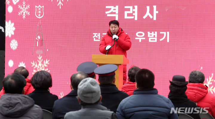 [전주=뉴시스] 김얼 기자 = 2023 구세군 자선냄비 시종식이 열린 2일 전북 전주시 전주중앙살림광장에서 우범기 전주시장이 격려사를 하고 있다. 2023.12.02. [email protected]