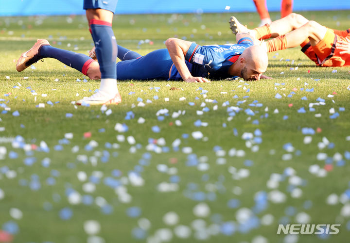 [수원=뉴시스] 김근수 기자 = 2일 오후 경기 수원시 수원월드컵경기장에서 열린 프로축구 하나원큐 K리그1 38라운드 수원삼성 블루윙즈와 강원FC의 경기, 후반 수원삼성 뮬리치가 발리슛에 실패한 후 아쉬워하고 있다. 2023.12.02. [email protected]