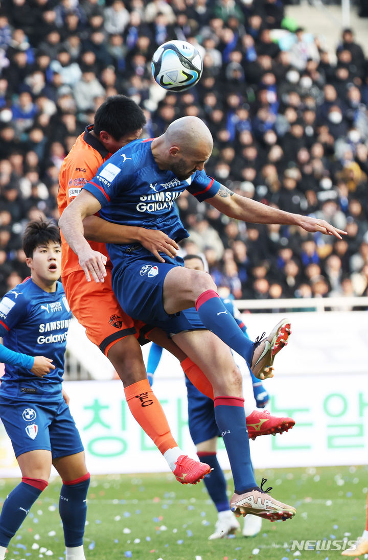 [수원=뉴시스] 김근수 기자 = 2일 오후 경기 수원시 수원월드컵경기장에서 열린 프로축구 하나원큐 K리그1 38라운드 수원삼성 블루윙즈와 강원FC의 경기, 후반 수원삼성 뮬리치와 강원FC 김영빈이 헤딩경합을 하고 있다. 2023.12.02. [email protected]
