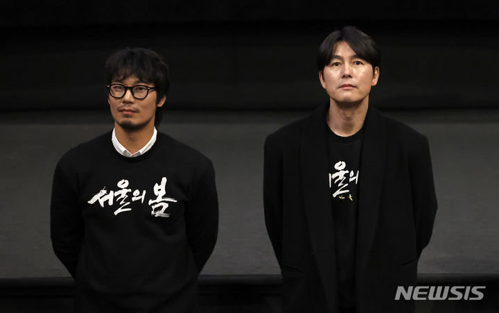 [서울=뉴시스] 김선웅 기자 = 영화 '서울의 봄' 출연 배우 박훈, 정우성이 3일 서울 CGV 왕십리에서 무대인사를 하고 있다. 2023.12.03. [email protected]