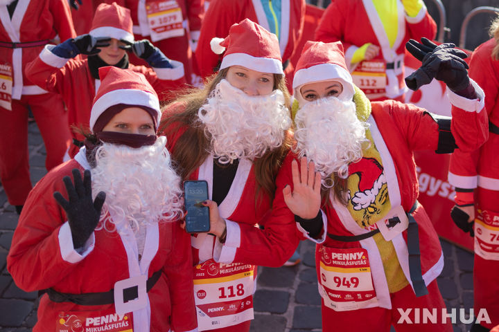 [부다페스트=신화/뉴시스] 3일(현지시각) 헝가리 부다페스트에서 제8회 산타달리기(산타런) 행사가 열려 산타 복장의 참가자들이 기념사진을 찍고 있다. 이날 행사에는 산타 복장의 참가자 약 2000명이 참가했다. 2023.12.04.
