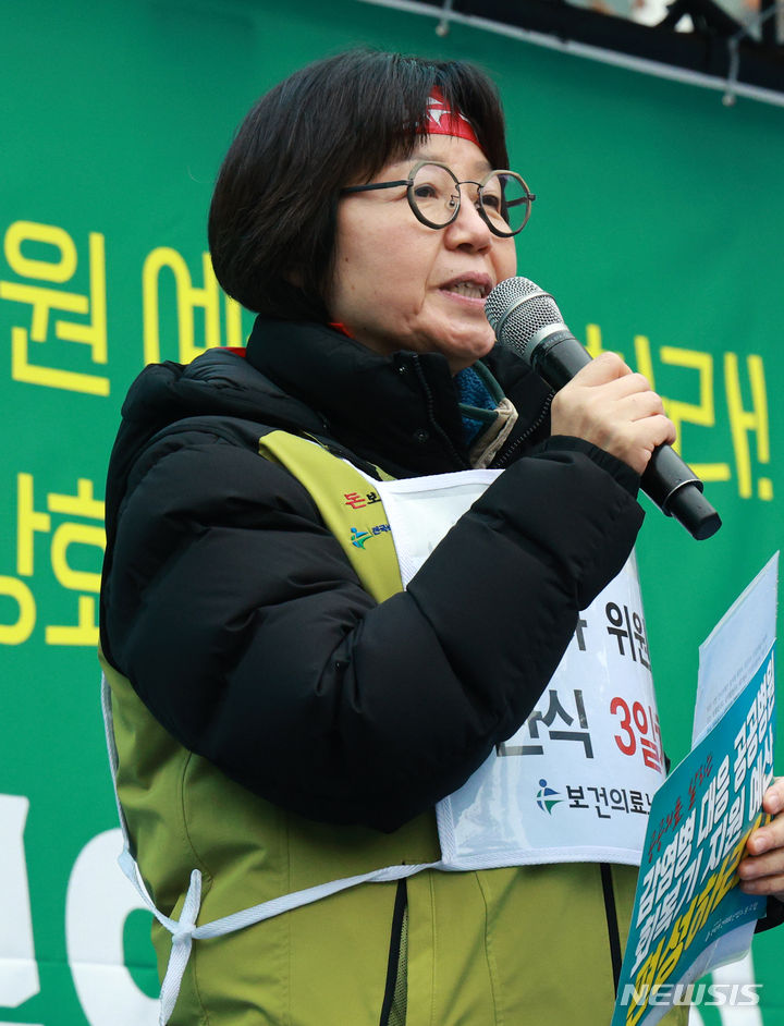 [서울=뉴시스] 고범준 기자 = 나순자 보건의료노조 위원장이 6일 오후 서울 여의도 국회 앞에서 열린 공공병원 회복기 지원 예산 촉구 보건의료노조 대회에서 대회사 하고 있다. 2023.12.06. [email protected]