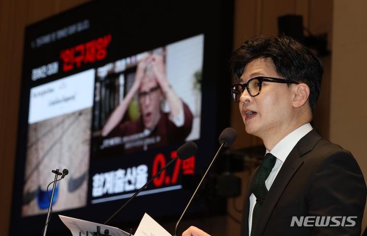 [서울=뉴시스] 조성봉 기자 = 한동훈 법무부 장관이 6일 오후 서울 여의도 국회에서 열린 국민의힘 정책의원총회에서 '출입국이민청 신설 방안'에 대해 설명하고 있다. 2023.12.06. [email protected]