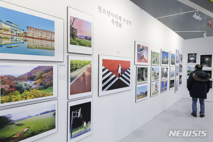 [서울=뉴시스] 최동준 기자 = 6일 서울 서초구 aT센터에서 열린 한국사진작가협회 주최 대한민국사진축전을 찾은 시민들이 청소년사진제 수상작을 관람하고 있다. 2023.12.06. [email protected]