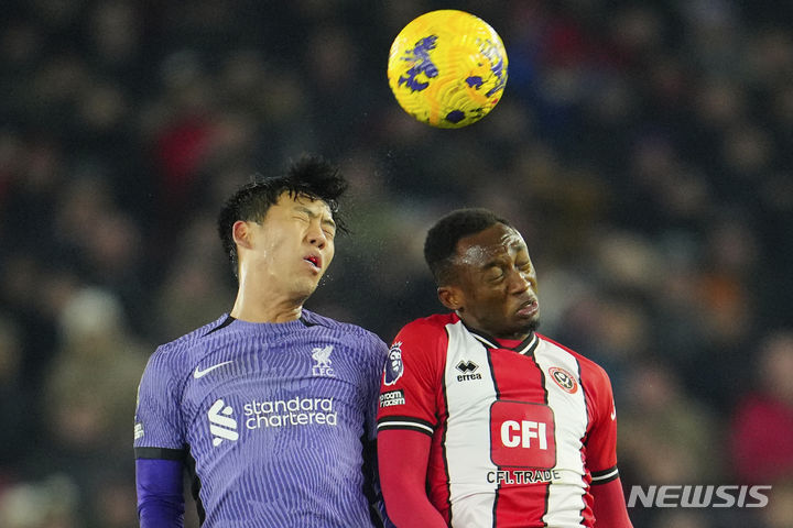 [셰필드=AP/뉴시스] 리버풀의 엔도 와타루(왼쪽)와 셰필드 유나이티드의 베니 트라오레가 6일(현지시각) 영국 셰필드의 브라몰레인에서 열린 2023-24 잉글랜드 프리미어리그(EPL) 15라운드 경기 중 공중 볼을 다투고 있다. 리그 2위인 리버풀이 최하위인 셰필드를 2-0으로 꺾었다. 2023.12.07.