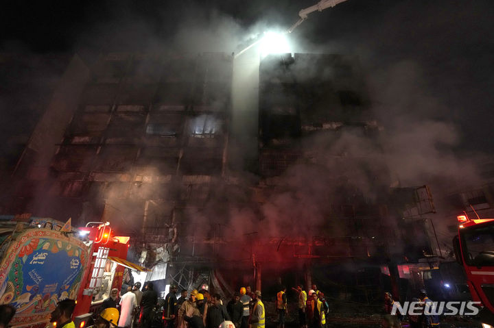 [카라치=AP/뉴시스] 6일(현지시각) 파키스탄 카라치의 다층 상가 건물에서 화재가 발생해 소방관들이 불을 끄고 있다. 경찰은 이 화재로 최소 3명이 숨지고 1명이 다쳤으며 화재 원인을 조사 중이라고 밝혔다. 2023.12.07.
