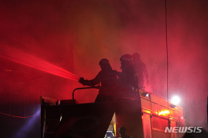 [카라치=AP/뉴시스] 6일(현지시각) 파키스탄 카라치의 다층 상가 건물에서 화재가 발생해 소방관들이 불을 끄고 있다. 경찰은 이 화재로 최소 3명이 숨지고 1명이 다쳤으며 화재 원인을 조사 중이라고 밝혔다. 2023.12.07.