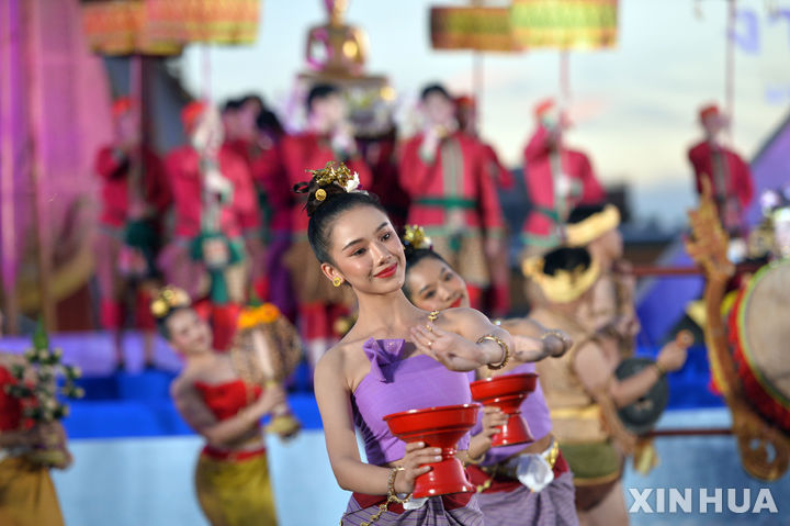 [방콕=신화/뉴시스] 7일(현지시각) 태국 방콕 시청 앞 광장에서 태국 새해 명절 축제 '송끄란'의 유네스코 무형 문화유산 등재 축하 공연이 열리고 있다. 물 축제로 유명한 '송끄란'은 지난 6일 보츠와나에서 열린 유네스코 제18차 무형문화유산보호협약 정부 간 위원회에서 무형 문화유산으로 등재됐다. 이로써 송끄란은 가면극 ‘콘’, 전통 마사지, 남부 전통무용 ‘노라’ 등에 이어 태국의 네 번째 유네스코 문화유산이 됐다. 2023.12.08.