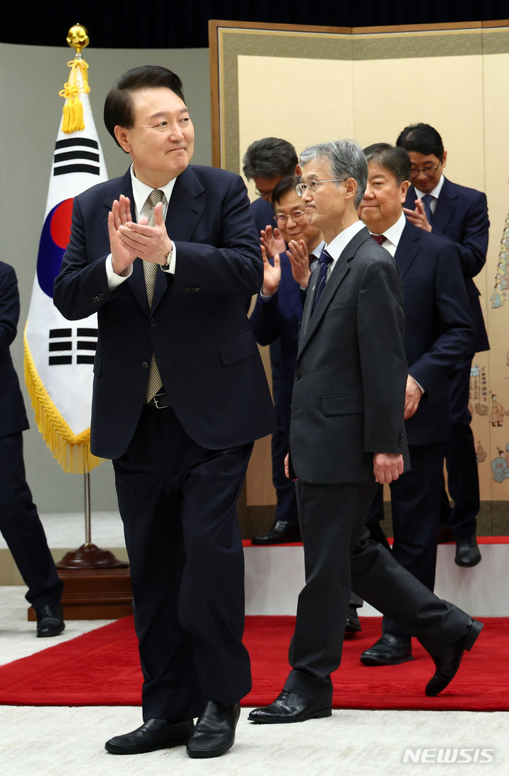 [서울=뉴시스] 전신 기자 = 윤석열 대통령이 8일 서울 용산 대통령실 청사에서 조희대 신임 대법원장에게 임명장을 수여한 뒤 환담장으로 이동하고 있다. 2023.12.08. [email protected]