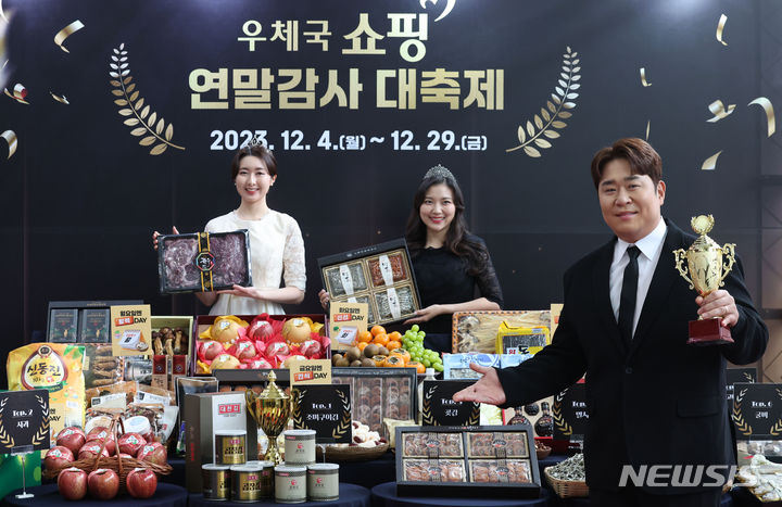 [서울=뉴시스] 권창회 기자 = 12일 서울 중구 서울중앙우체국에서 문세윤과 모델들이 우체국쇼핑 2023 연말감사 대축제를 알리고 있다.우정사업본부는 오는 29일까지 우수 팔도 농·수·축산물 및 중소상공인·전통시장 등의 상품을 최대 40% 할인해서 판매한다. 2023.12.12. [email protected]