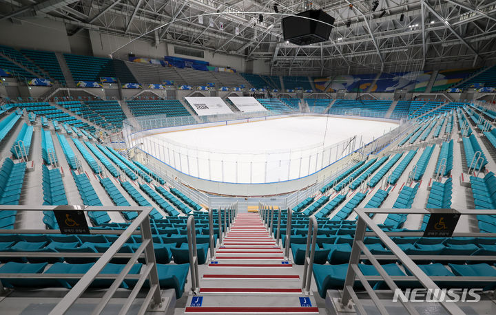 [강릉=뉴시스] 황준선 기자 = 2024 강원 동계 청소년올림픽 대회가 지난 2018 평창 동계올림픽이 치뤄졌던 강원특별자치도(강릉,평창,정선,횡성) 일대에서 열린다. 아시아에서 처음 개최되는 이번 동계 청소년 올림픽은 내년 1월 19일부터 2월 1일까지 개최된다. 사진은 아이스 하키 경기가 열리는 강원 강릉시 하키센터. 2023.12.13. [email protected]