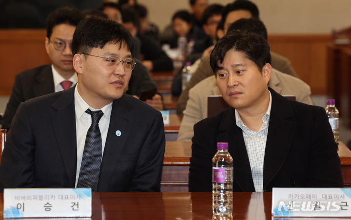 [서울=뉴시스] 김근수 기자 = 신원근(오른쪽) 카카오페이 대표이사와 이승건 비바리퍼블리카 대표이사가 22일 오전 서울 영등포구 여의도 금융감독원 대회의실에서 열린 전자금융업권의 자금세탁방지 체계 개선을 위한 간담회에 이야기를 나누고 있다. 2023.12.22. [email protected]