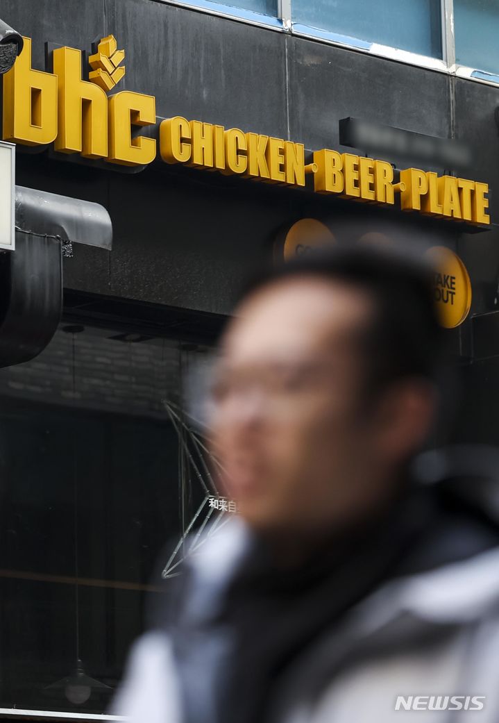 [서울=뉴시스] 정병혁 기자 = 치킨 프랜차이즈 bhc가 치킨 가격 인상에 나선다. 이달 29일부터 치킨 메뉴를 비롯한 85개 제품의 권장 소비자 가격을 500~3000원 범위에서 전국 매장에 동시 적용하기로 했다. 이번 가격 조정으로 현재 1만7000~1만8000원대의 bhc치킨 가격은 2만~2만1000원으로 평균 12.4% 오른다. 27일 서울시내 bhc매장 앞에서 시민들이 이동하고 있다. 2023.12.27. [email protected]