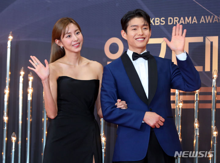 [서울=뉴시스] 김혜진 기자 = 배우 유이, 하준이 31일 오후 서울 영등포구 여의도 KBS에서 열린 2023 KBS 연기대상 시상식에서 포즈를 취하고 있다. 2023.12.31. [email protected]