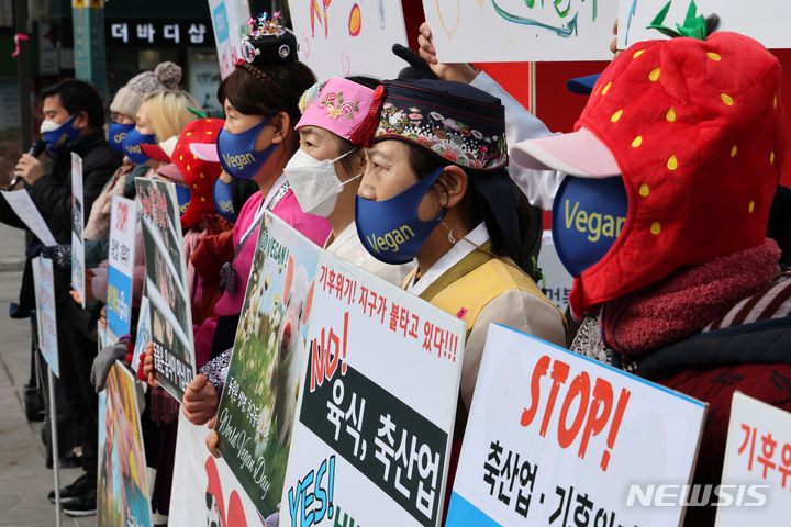 [서울=뉴시스] 배훈식 기자 = 한국채식연합 회원들이 1일 오후 서울 종로구 세종대로사거리에서 새해맞이 건강한 비건 채식을 촉구하고 있다. 2024.01.01. [email protected]