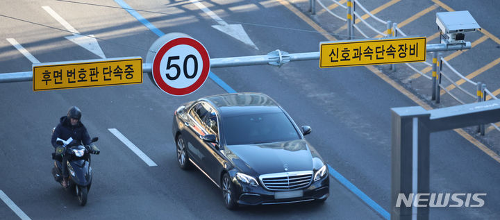 [서울=뉴시스] 김금보 기자 = 8일부터 후면 단속카메라를 활용한 이륜차 안전모 미착용 무인 단속이 시행된다. 경찰은 전국 73개소에서 단속·계도·홍보를 하고 오는 3월 1일부터 점진적으로 정식 단속을 실시한다. 사진은 이날 서울 시내에 설치된 후면 번호판 단속 장비. 2024.01.08. [email protected]