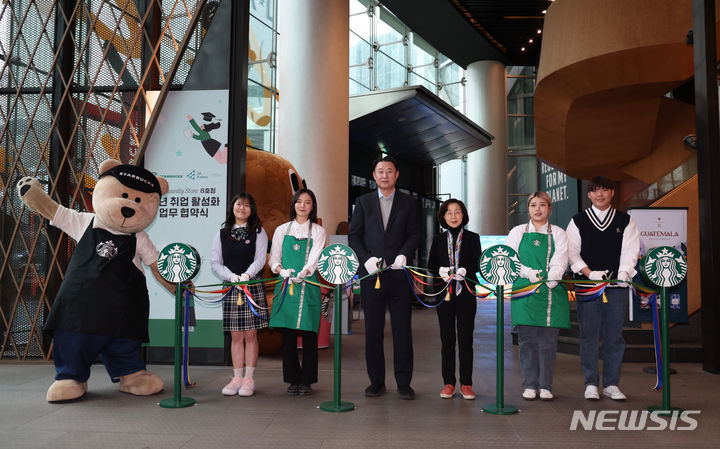 [서울=뉴시스] 고승민 기자 = 손정현 스타벅스코리아 대표이사와 이은형 JA코리아 대표가 9일 서울 스타벅스 종로R점에서 열린 커뮤니티 스토어 8호점 청년취업 활성화 업무협약식에서 청년 참석자 등과 스토어 오픈 테입 커팅식을 하고 있다. 2024.01.09. [email protected]