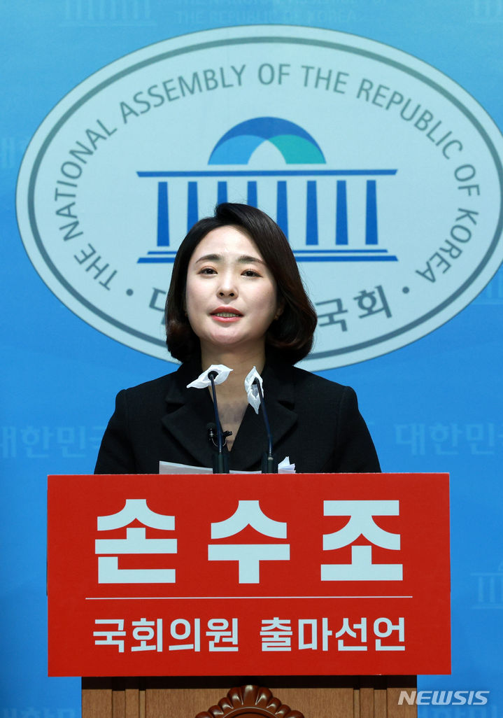 [서울=뉴시스] 고범준 기자 = 손수조 리더스클럽 대표가 9일 오후 서울 여의도 국회 소통관에서 제22대 총선 동두천·연천 출마선언 기자회견을 하고 있다. 2024.01.09. [email protected]