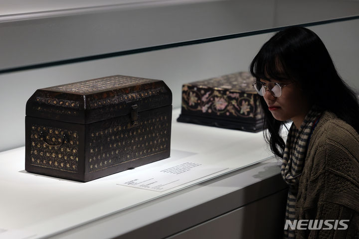 [서울=뉴시스] 박진희 기자 = 국립중앙박물관은 새롭게 단장한 기증관 재개관을 앞둔 11일 서울 용산구 국립중앙박물관 기증관에서 언론공개회를 갖고 국립중앙박물관회 기증품인 고려 후기 '나전 칠 경전 상자'를 공개하고 있다. 2024.01.11. [email protected]