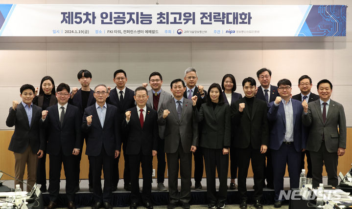 [서울=뉴시스] 김금보 기자 = 이종호(앞줄 왼쪽 네번째) 과학기술정보통신부 장관이 19일 서울 영등포구 여의도 FKI타워컨퍼런스센터에서 열린 '제5차 인공지능 최고위 전략대화'에서 참석자들과 기념촬영을 하고 있다. 이날 행사에는 이종호 과기정통부 장관, 고진 디지털플랫폼정부위원회 위원장, 박윤규 과학기술정보통신부 제2차관, 허성욱 정보통신산업진흥원 원장, 황종성 한국지능정보사회진흥원 원장, 최수연 네이버 대표, 정신아 카카오 대표(내정자), 배경훈 LG AI연구원 원장, 류정훈 두산로보틱스 대표, 김승환 아모레퍼시픽 대표, 용석우 삼성전자 영상디스플레이사업부 사장, 김영섭 KT 대표와 2024 CES 혁신상 수상기업인 강성훈 스튜디오랩 대표, 김정현 리빌더에이아이 대표, 이동윤 앙트러리얼리티 대표, 김녹원 딥엑스 대표, 유수연 네이션에이 대표가 참석했다. 2024.01.19. [email protected]