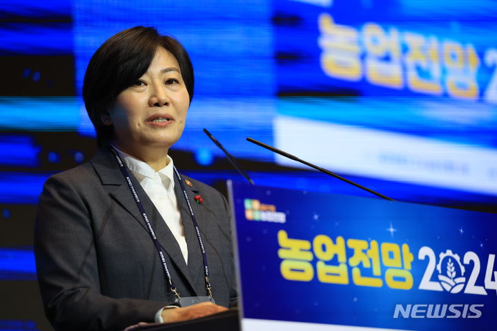 [세종=뉴시스] 송미령 농림축산식품부 장관이 25일 서울 용산구 드래곤시티 호텔에서 농업인, 농업관련 기관·단체, 소비자, 학계 및 정부기관 관계자 등이 참석한 가운데 개최된 한국농촌연구원(KREI) 주관 제27회 '농업전망 2024'에서 환영사를 하고 있다. (사진=농식품부 제공)