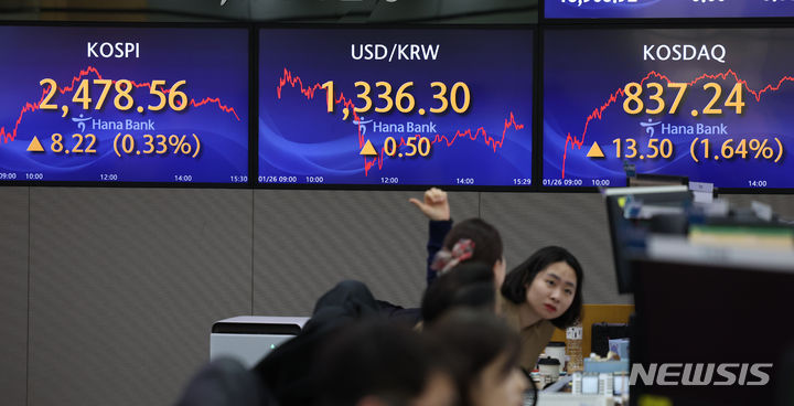 [서울=뉴시스] 고승민 기자 = 코스피 지수가 전 거래일(2470.34)보다 8.22포인트(0.33%) 오른 2478.56에 장을 마친 26일 서울 중구 하나은행 딜링룸에서 딜러들이 업무를 보고 있다. 코스닥 지수는 전 거래일(823.74)보다 13.50포인트(1.64%) 상승한 837.24에 거래를 종료했다. 서울 외환시장에서 원·달러 환율은 전 거래일(1335.8원)보다 0.5원 오른 1336.3원에 마감했다. 2024.01.26. [email protected]