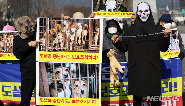 [서울=뉴시스] 김선웅 기자 = 한국동물보호연합 관계자들이 30일 서울 종로구 광화문광장에서 기자회견을 열고 개 농장에 남아있는 개에 대한 도살 중단 및 보호조치, 개 보호소 전환을 촉구하는 퍼포먼스를 하고 있다. 2024.01.30. [email protected]