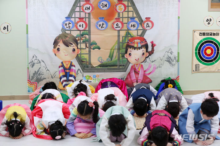 [서울=뉴시스] 김혜진 기자 = 설 명절을 나흘 앞둔 5일 오전 서울 송파구 삼전초록어린이집에서 설빔을 입은 어린이들이 세배를 하고 있다. 2024.02.05. [email protected]