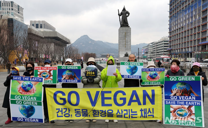 [서울=뉴시스] 배훈식 기자 = 한국채식연합 회원들이 6일 오후 서울 종로구 세종대로사거리 인근에서 기자회견을 열고 지구를 살리는 비건 채식을 촉구하고 있다. 2024.02.06. [email protected]